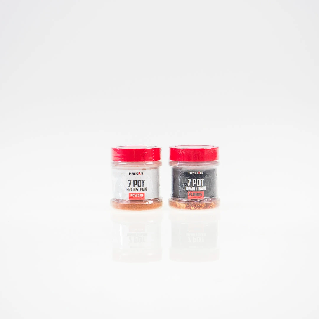 To create our pepper flakes and powder, we harvested fresh 7 Pot Brain Strain peppers at their freshest and ripest and crushed them into fiery dust. Stock your pantry with this crazy hot bundle, or surprise a friend or family relative whoโs been wanting to try a different type of seasoning that bursts with amazing smoky and fruity flavors!