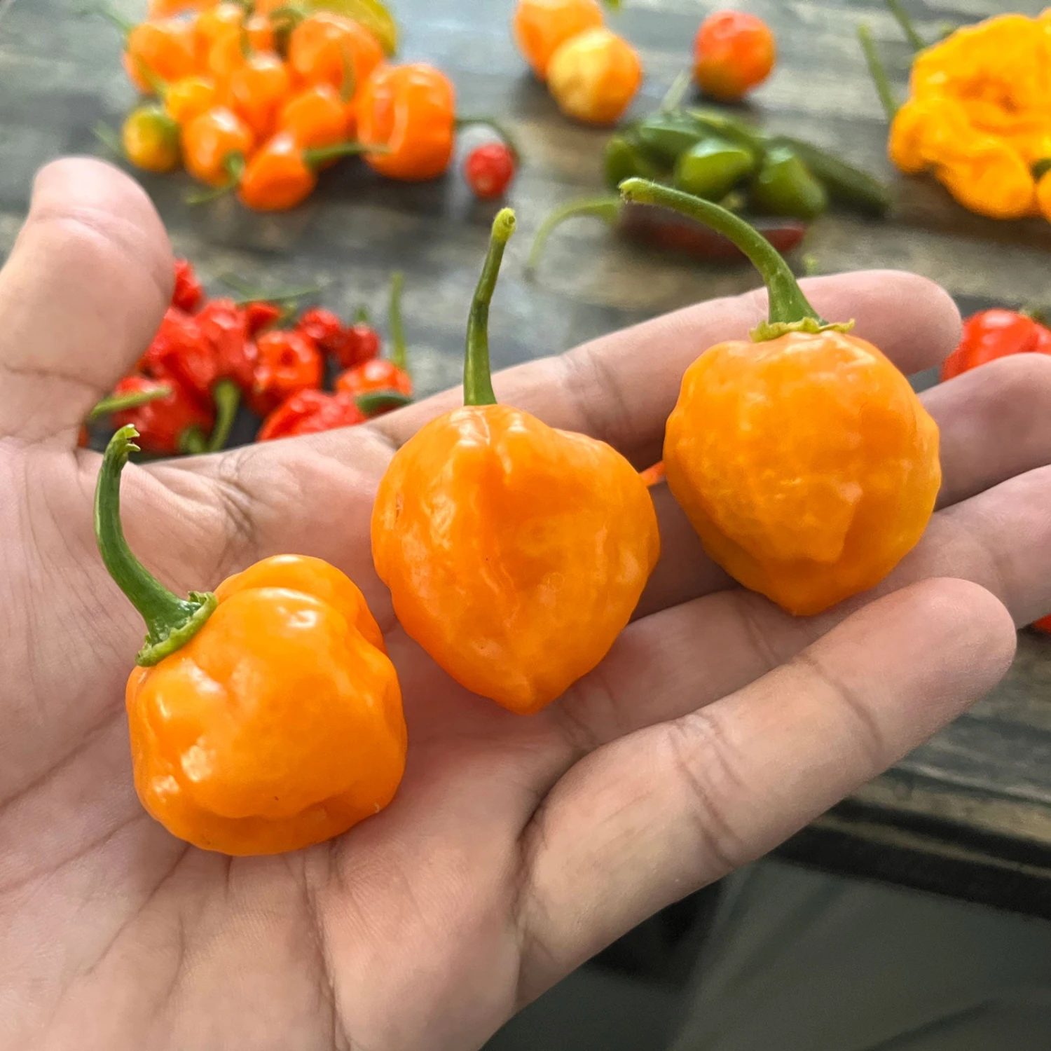 Pepper plants will grow up to 4 ft. tall and produce very high yields of these 2-3″ long fruits. Pods have a unique shape that almost reminds you of a Scotch Bonnet. They ripen from dark green to a beautiful light peachy orange color, and the smooth pods sometimes develop a cute little stinger.