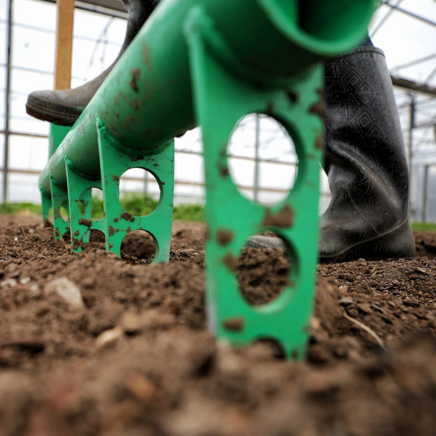 Simply insert the tines into the soil at the end of your bed and step down on the crossbar, using body weight to insert deeply. Rock gently and pull back on the handles to aerate the soil without overturning it. After a 45° handle tilt, remove the tines and move to the next section. For new soil, a second pass might be necessary to fully establish aeration channels.