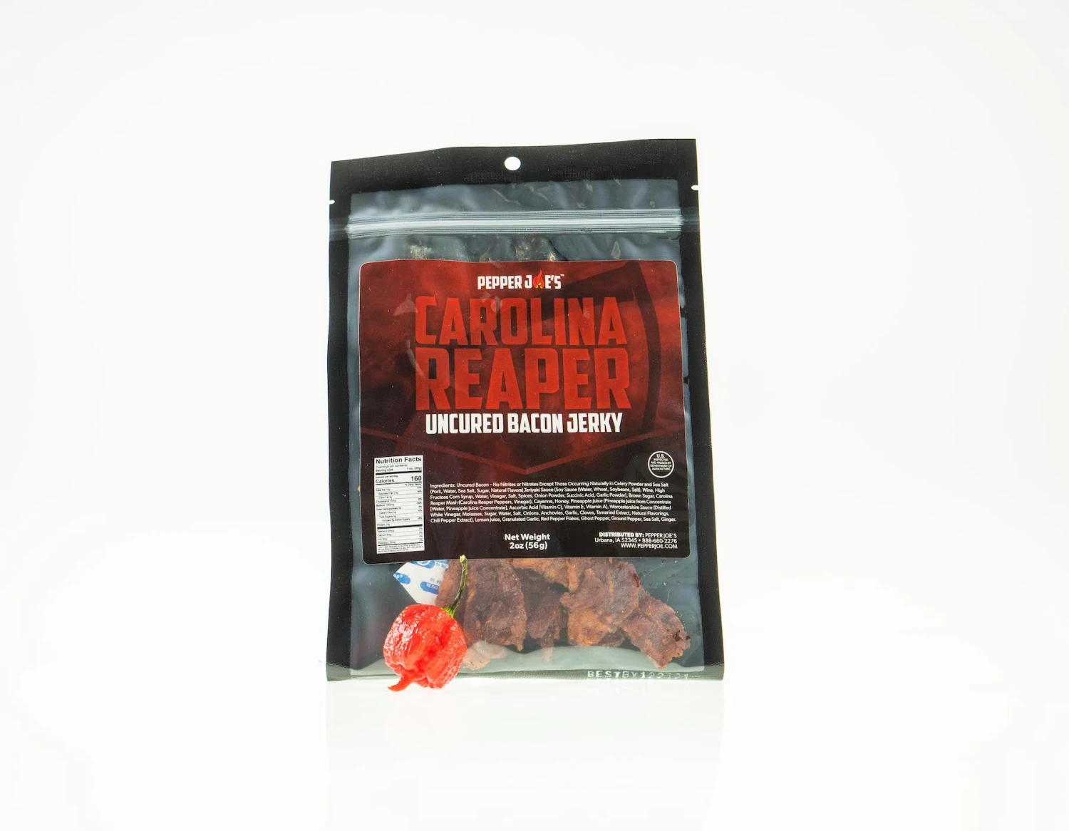 Do you love the Carolina Reaper hot pepper? Do you love beef jerky!? Do you love bacon!?!? Our brand new Carolina Reaper Bacon Jerky is perhaps one of the hottest items available in our store. Buckle up and make sure you have a drink nearby because this hot pepper bacon jerky is going to take you for a ride. It gives you a few seconds of sweet before unleashing its delicious but CRAZY HOT pepper fury. This mouth-scorching recipe is not for the faint of heart, but trust us when we say, youโre gonna love it.