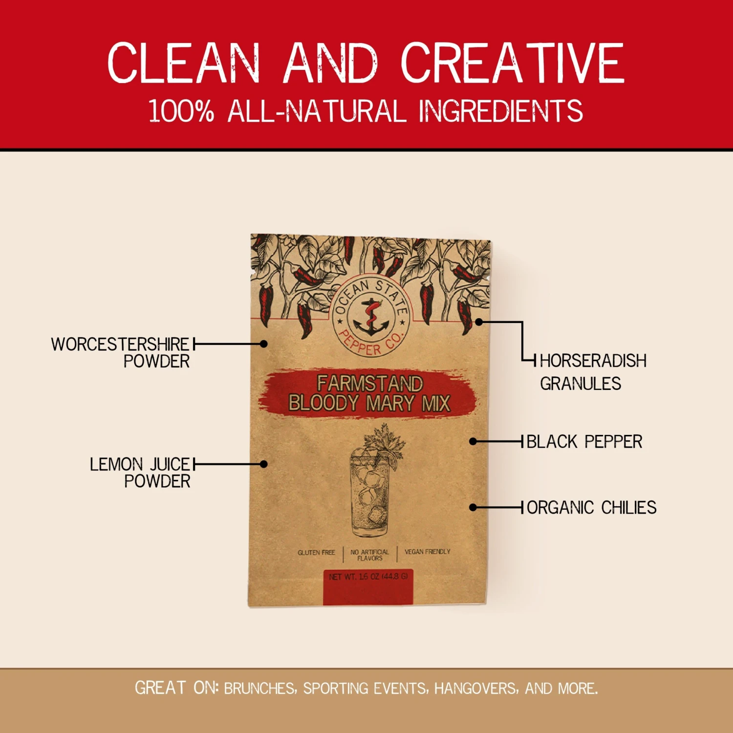 Developed in collaboration with local tomato farmers, this is a great blend to have in the spice cabinet. Horseradish, worcestershire sauce, celery salt, coarse ground pepper, and lemon juice…this drink mix doesn’t have be complicated to taste great. Use a dash here and there to spice up that marginal store bought mix, or add the entire packet to one quart of tomato juice for a fresh party-sized drink mix. Use it with single serving tomato juice cans when you only need to make a drink at a time. This bold, citrusy mix answers the call at a moments notice. You can get rid of that bottle of bloody mary mix in the back of your fridge…who knows when that thing is from. No preservatives, no problem.