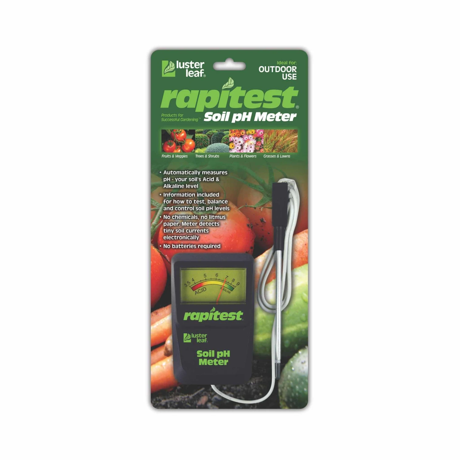 The Luster Leaf Rapitest Soil pH Meter makes it simple to test your soilโs acidity or alkalinity and create the right growing environment for your plants. With a durable stainless steel probe and easy-to-read analog dial, this meter gives quick, reliable pH readings indoors or outdoorsโno batteries, litmus paper, or chemicals required.