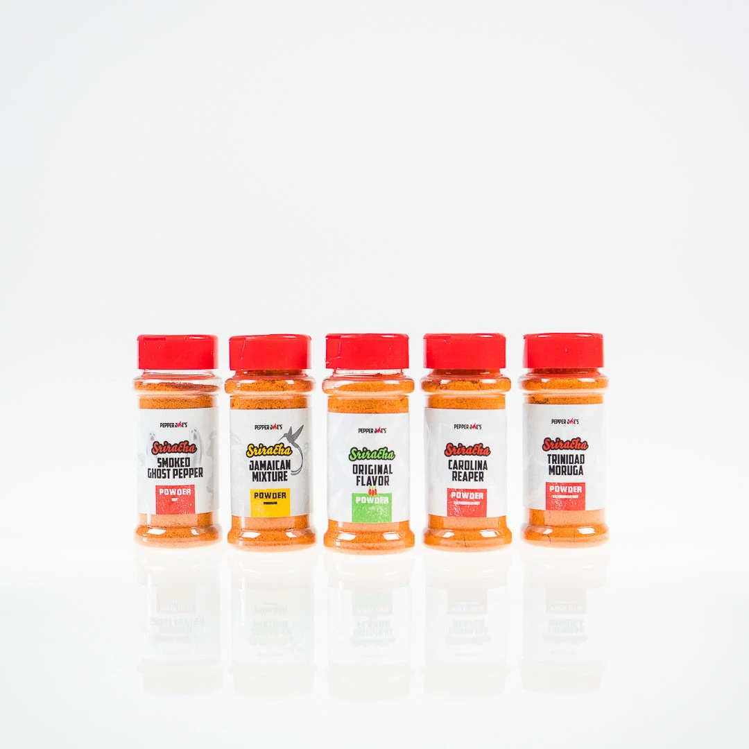 Love Sriracha sauce? What if we told you that you can use Sriracha Powder as a powerful seasoning ingredient? We kicked it up a notch by creating a bundle of superhot Sriracha pepper powders that you can obsessively sprinkle on your favorite food for intense heat and flavors! Each multi-purpose Sriracha powder has flavorful ingredients like garlic, vinegar, salt, and sugar combined with freshly harvested superhot peppers that were crushed into perfect fiery dust. The powders are uniquely addictive and widely versatile to use for cooking, make custom hot sauces, or create an amazing seasoning blend. Each powder has different heat levels to test your heat tolerance.